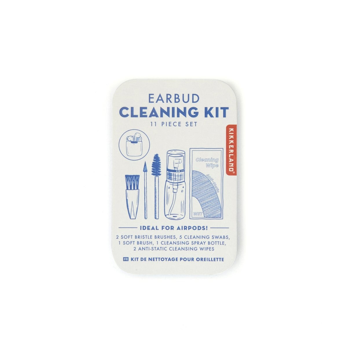 This eleven-piece kit has everything you need to keep your earbuds looking and sounding great. Kit includes 2 soft bristle brushes, 5 extra fine cleaning swabs, 1 soft brush, 1 cleaning spray bottle, and 2 anti-static cleaning wipes in a convenient tin.