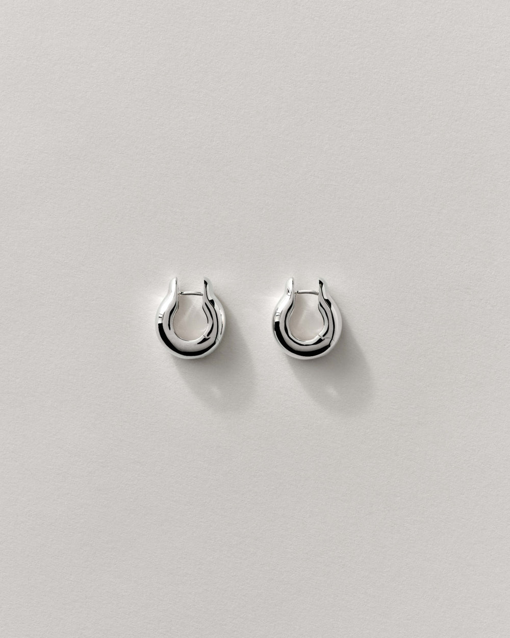 Sculptural hoops made of smooth Sterling silver, fastened with a hinge snap closure. Sold as a pair.