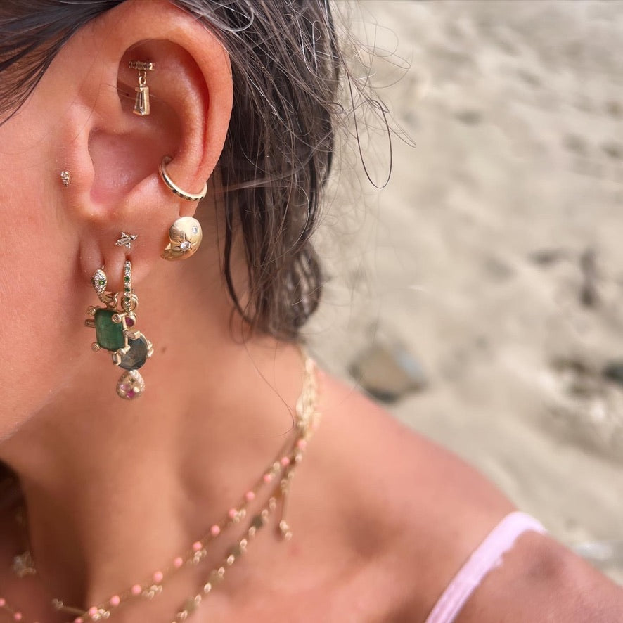 Sitting close to the ear with a smooth, sculptural curve & high-polish shine, these huggie's snap open & closed with a clean hinge for effortless, everyday wear. Set with bright white diamonds, the Disco Huggie brings instant sparkle & serious attitude. Your must-have piece to turn any ear stack into a full-on party.