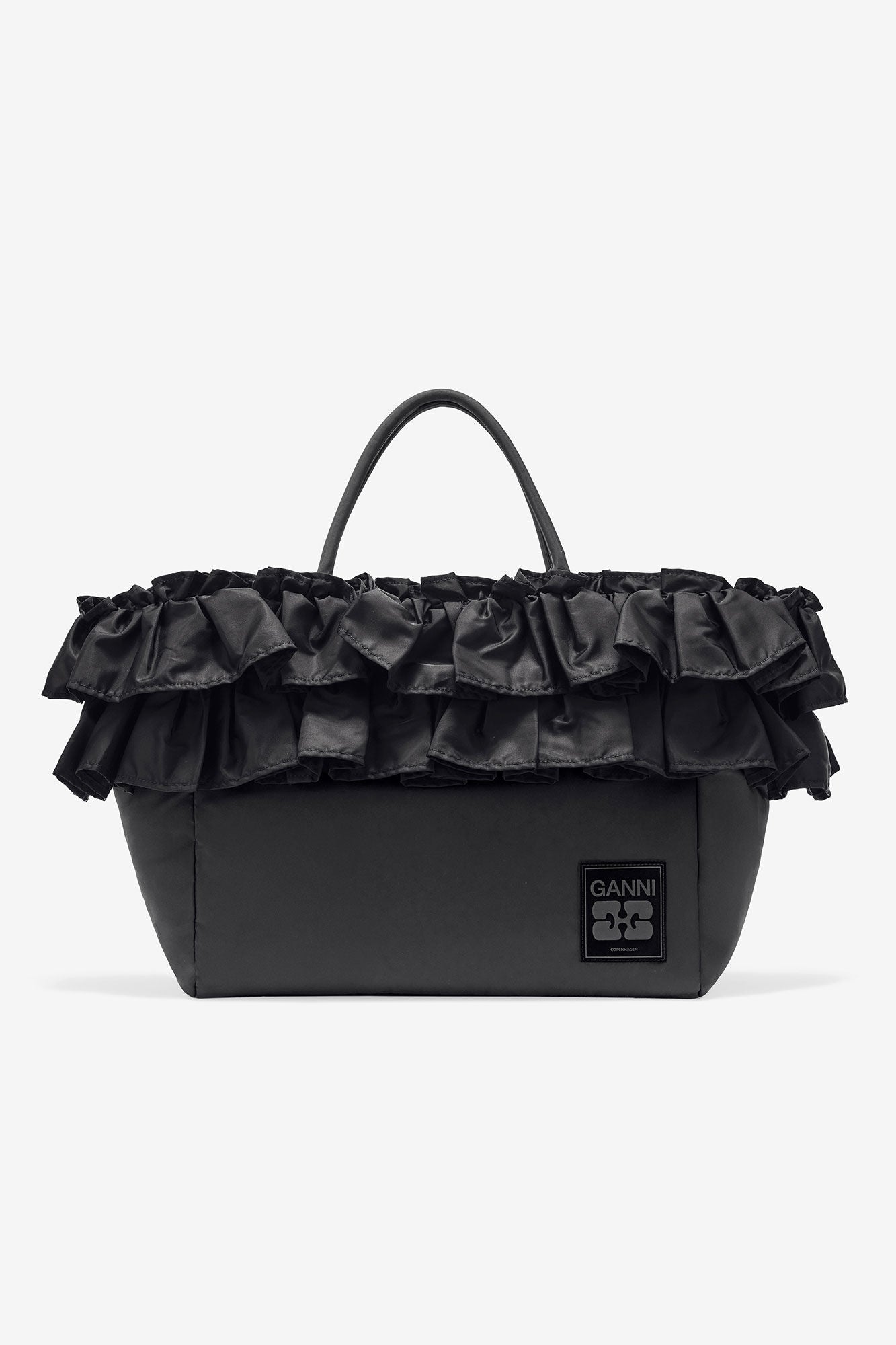 This tote bag features top handles, one large compartment, a GANNI logo and ruffle detailing.