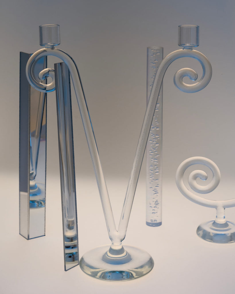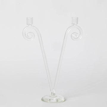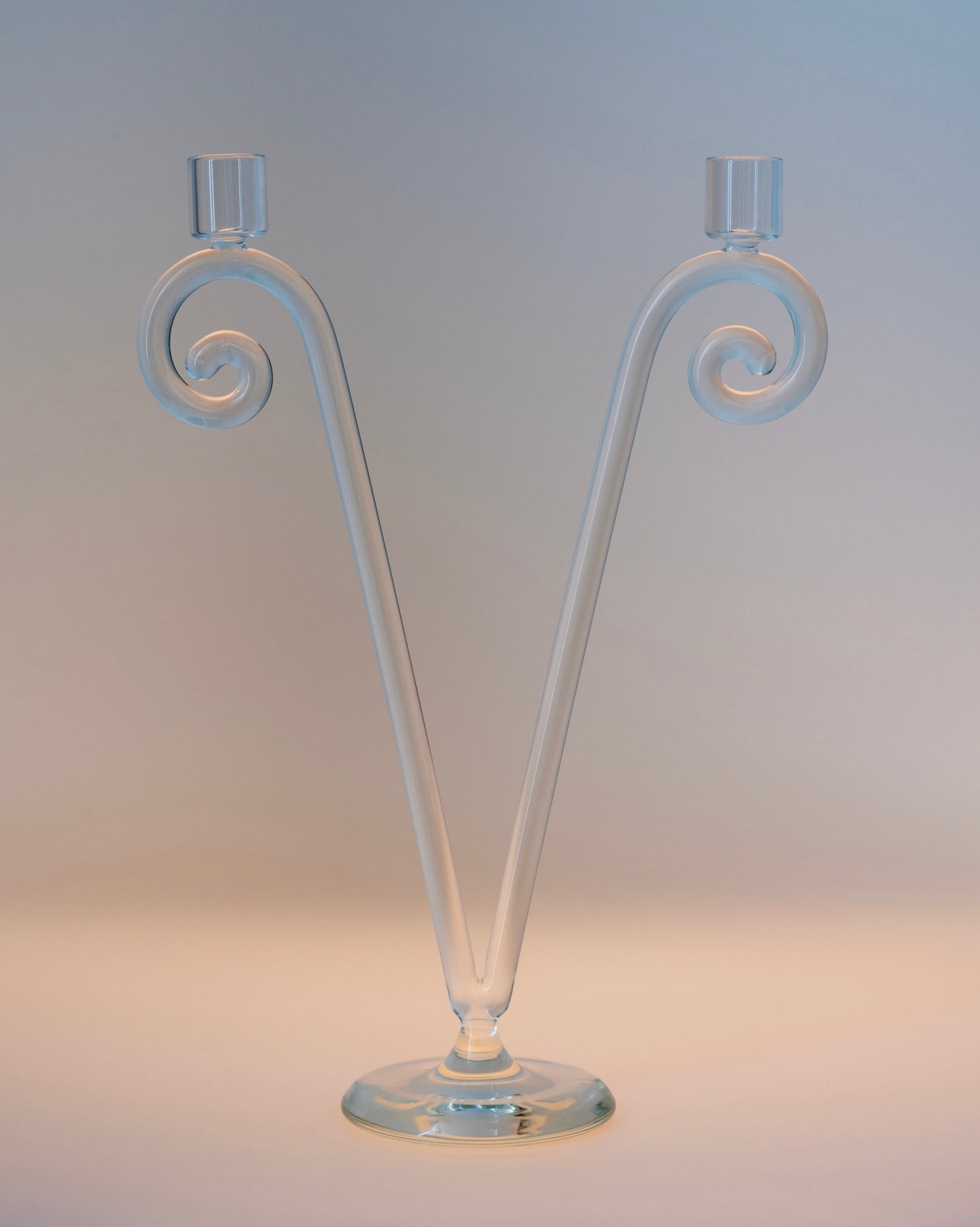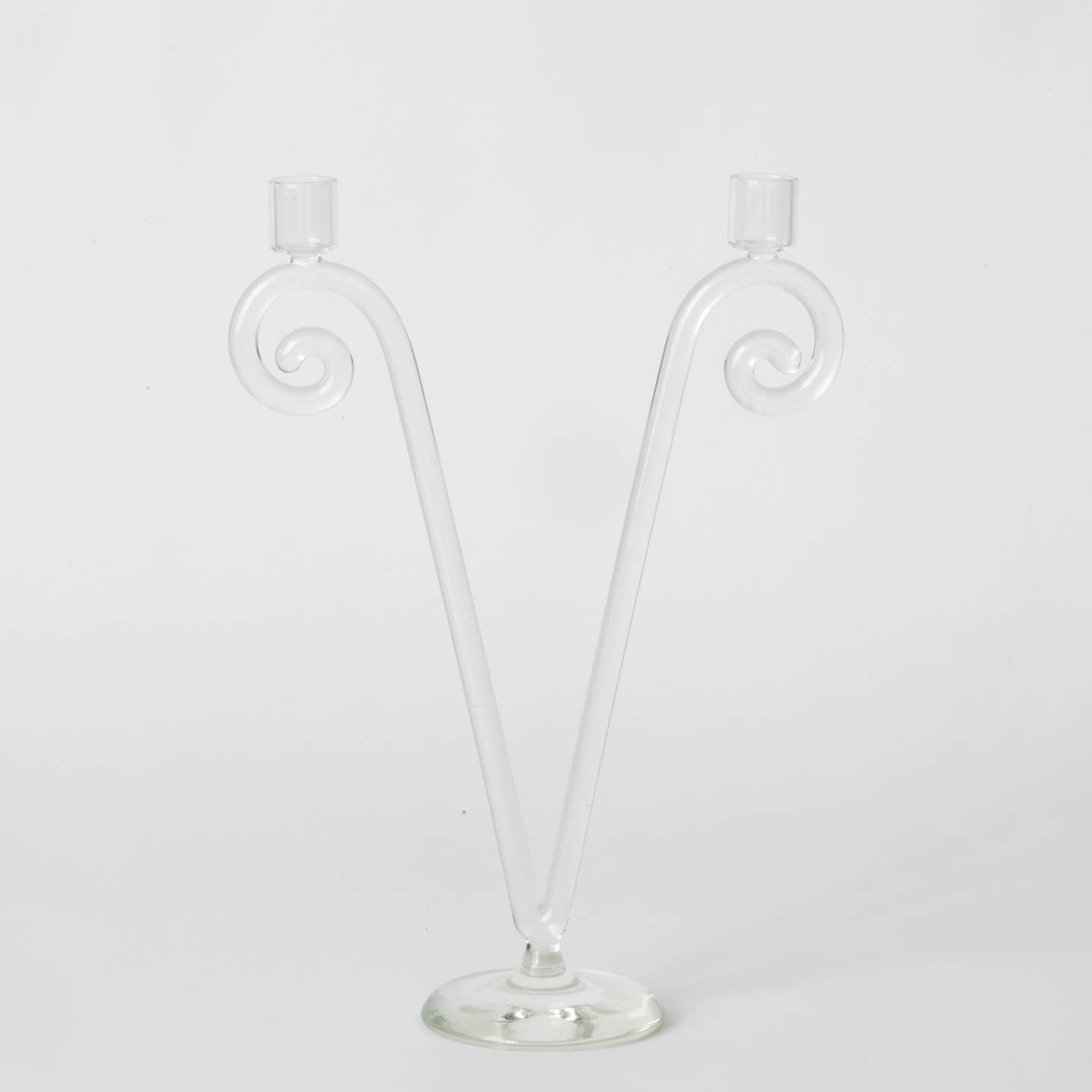 Sophisticated and sculptural, this tall glass candelabra offers opposing side scrolls that mirror the shape of curling spirals. Its spirit evokes a sense of fine old-world dining & the decorative arts of the 1930s.