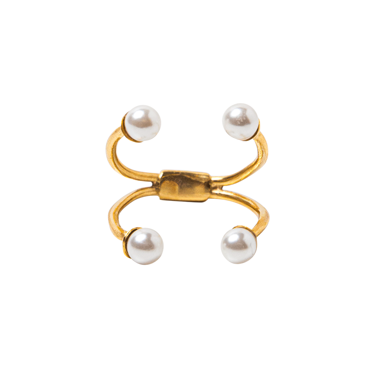 Handcrafted in 18k Gold Vermeil, this open, adjustable dual‑band ring features four South Pacific pearls that seem to float above your finger—like miniature works of art. Sleek, clever, & effortlessly striking, it adds a modern, refined touch. Handmade in Spain.