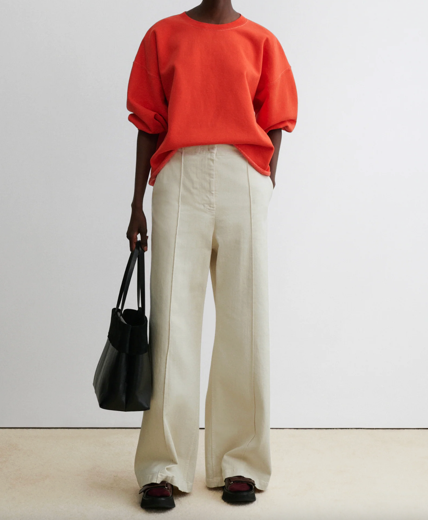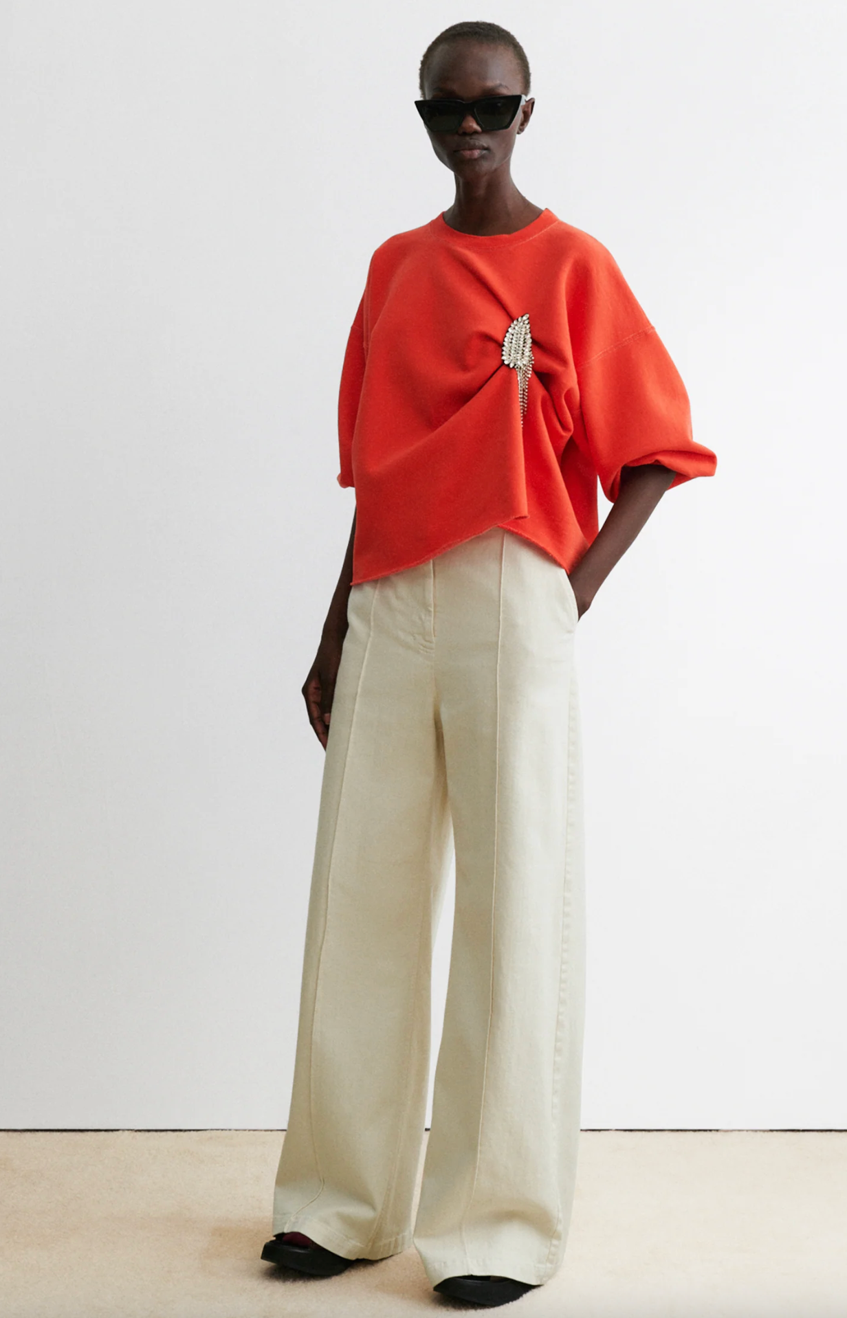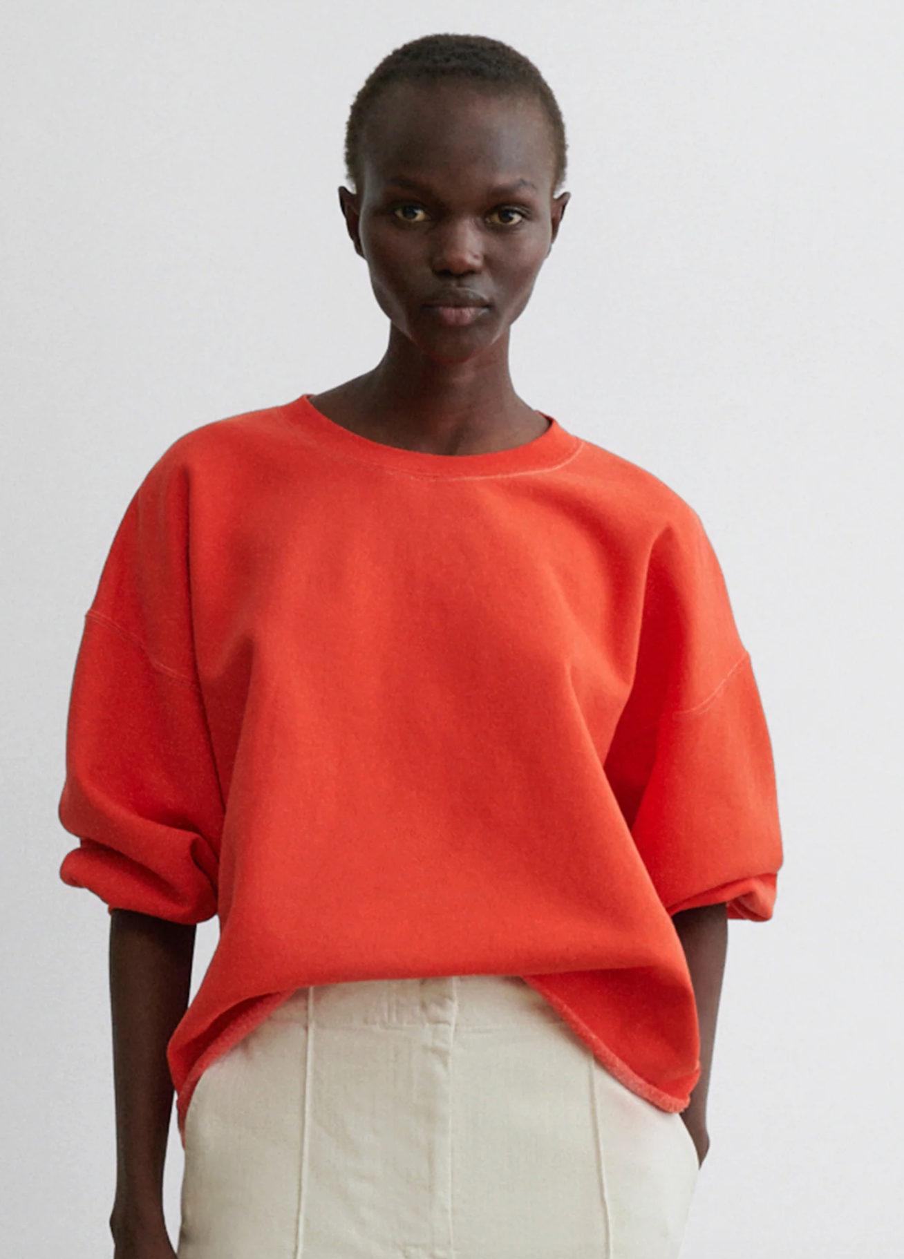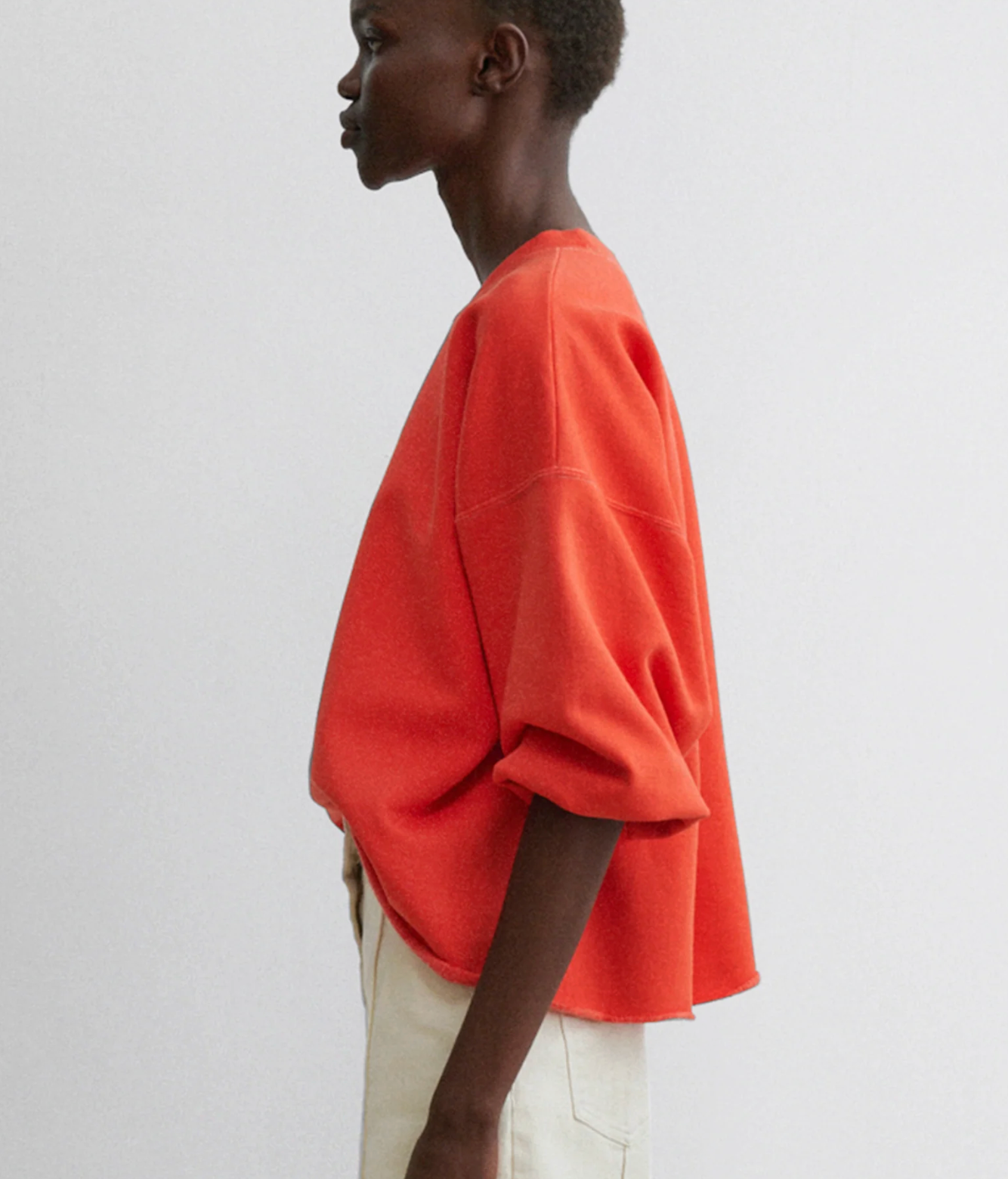 Rachel Comey's classic crewneck sweatshirt features drop shoulders, cropped sleeves, and a raw edge hemline with unique distressing throughout. It's a versatile piece that adds a touch of effortless style to any outfit.