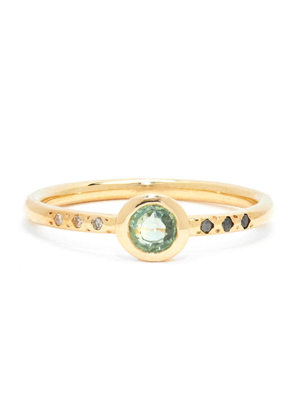 Cast in solid yellow gold, this striking ring features a vivid green sapphire at its center, framed by a split pavé band, with white diamonds shimmering on one side, black diamonds adding bold contrast on the other.