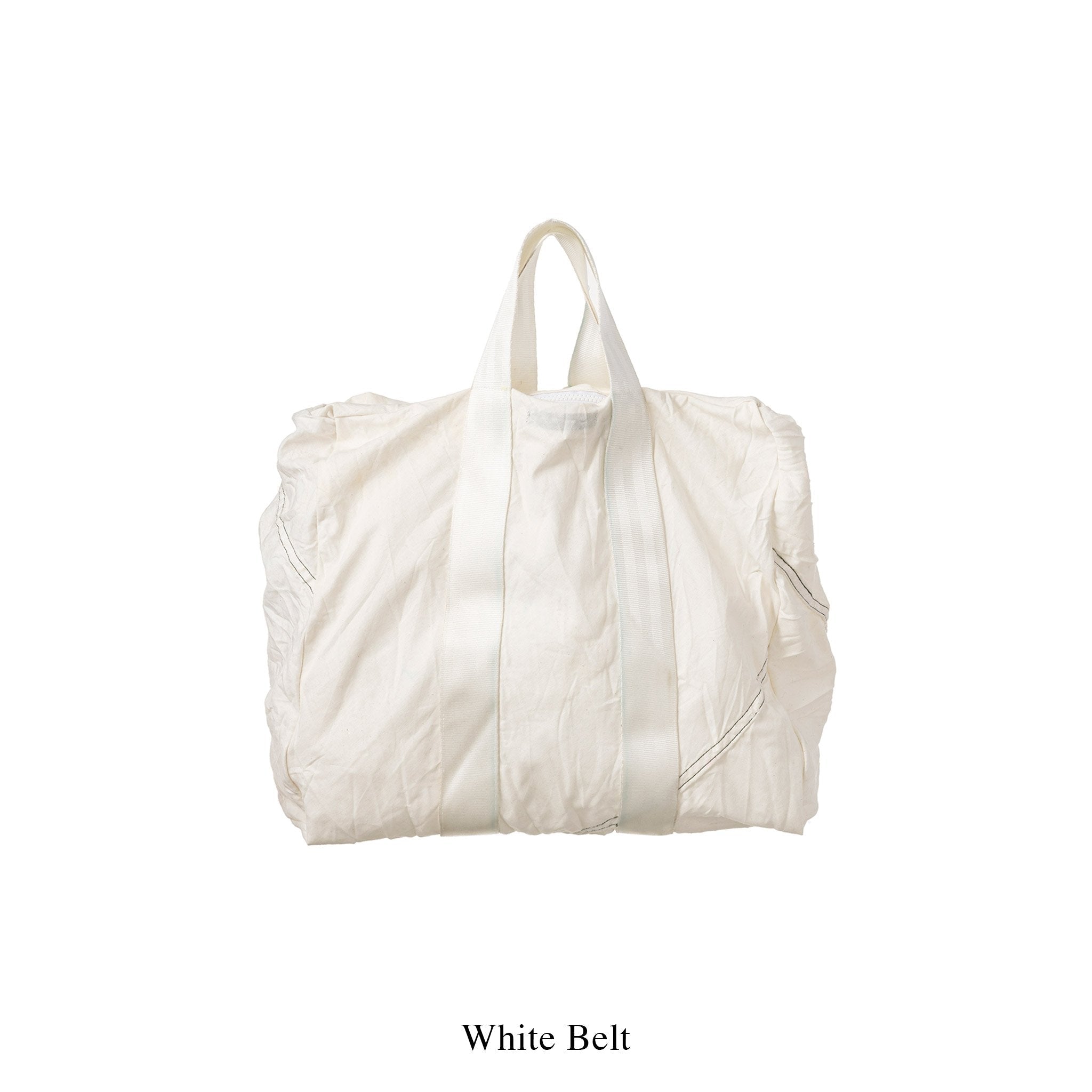 We purchased big parachute fabric that is not being used for its original purpose anymore. It’s distinctively lightweight and strong. Although it’s hard to tell because they look similar, there are two types of fabrics combined; rip stop fabric with threads woven in a lattice pattern to prevent tearing and a plain weave non-slip fabric. Handles made from dead stock or used industrial belts were used as inspiration to develop several of the items available. The materials were discovered in a town in India. White Belt / Green Belt Approximate Size: H 15.75 in. x W 17.7 in. x D 6.3 in. Design: Assorted Material: Repurposed Fabric (Cotton, others), Repurposed Belt